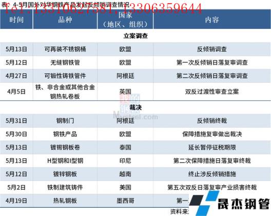 免責聲明:本網站(山東聊城宅男666网站無縫鋼管廠www.fengyun0769.com)刊載的“4-5月國外對華鋼鐵產品發起反傾銷調查情況”等均源於網絡,版權歸原作者所有,且僅代表原作者觀點,本文所載信息僅供參考。轉載僅為學習與交流之目的,如無意中侵犯您的合法權益,請及時聯係刪除。本網站刊登此篇文章並不意味著本站讚同其觀點或證實其內容的真實性,宅男666网站不對其科學性、嚴肅性等作任何形式的保證。如果侵犯了您的版權,請盡快聯係宅男666网站予以撤銷,謝謝合作!