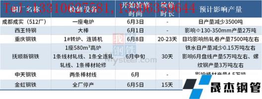 據不完全統計,截至6月7日,國內6家無縫宅男在线小视频鋼管廠家發布檢修計劃。其中,撫順新鋼鐵計劃6月中旬起對廠內1座580m³高爐進行30天左右的年修,預計鐵水日產量減少0.15萬噸左右、共影響鐵水產量4.5萬噸左右;同時1條線材軋線、1條全連軋軋線、1條棒材輪修,預計影響6月盤線產量5萬噸左右、螺紋鋼產量3萬噸左右。