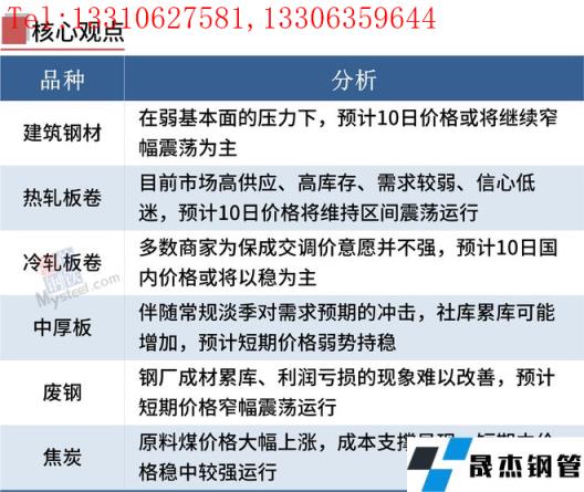 冷軋板卷:6月9日,全國24個主要城市1.0mm冷卷均價5435元/噸,較上個交易日下跌5元/噸。市場需求持續疲軟,下遊企業按需采購,據悉,目前部分商家低價成交尚可,高價成交艱難,多以出貨回籠資金為主。即便黑色係期貨盤麵震蕩偏強運行,但現貨市場跟漲動力不足,多數商家為保成交調價意願並不強,且整體市場成交處於中等偏下水平。庫存方麵,本周冷軋無縫宅男在线小视频鋼管廠家庫存40.43萬噸,周環比減少0.32萬噸,社會庫存136.09萬噸,周環比減少0.02萬噸,周消費量84.21萬噸,環比增加0.51萬噸。綜合來看,預計10日國內冷軋板卷價格或將以穩為主。