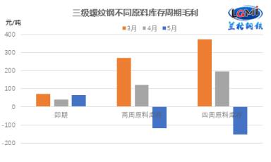 5月份由於成本表現分化,市場均值震蕩下行,使得5月份品種噸鋼毛利相比上月有明顯差異。以三級螺紋鋼為例,以即期原料成本測算5月份毛利空間較上月上升25元/噸,以兩周、四周原料庫存周期測算5月份毛利空間均進入虧損負值區間,兩周原料庫存周期測算毛利較上月減少239元/噸,以四周原料庫存周期測算5月份毛利空間較上月減少347元/噸(詳見圖2)。
