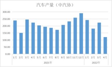 根據中國汽車工業協會統計數據顯示,2022年4月份,汽車產銷分別完成120.5萬輛和118.1萬輛,環比分別下降46.2%和47.1%,同比分別下降46.1%和47.6%。1-4月,汽車產銷分別完成769.0萬輛和769.1萬輛,同比分別下降10.5%和12.1%。
