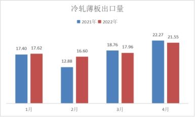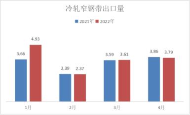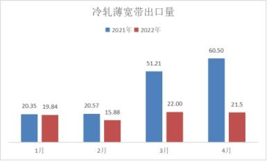 冷軋品種出口方麵,4月份出口量同比下降,尤其以冷軋薄寬帶下降幅度最大,具體數據來看,冷軋薄板出口量為21.55萬噸,同比下降3.23%;冷軋薄寬帶出口量為21.5萬噸,同比下降64.46%,冷軋窄鋼帶出口量為3.79萬噸,同比下降1.81%。