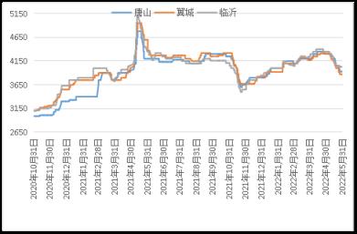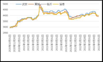 據雲商平台監測數據顯示,截至5月31日,煉鋼生鐵天津地區報價3910元(噸價,下同),較月初跌360元;唐山地區報價3930元,較月初跌370元;翼城地區報價3870元,較月初跌440元;臨沂地區報價4030元,較月初跌320元(詳見圖2)。
