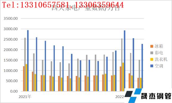2022年4月份,冰箱產量652.4萬台,同比下降15.8%;彩電產量1512.7萬台,同比增長1.5%;洗衣機產量649.9萬台,同比下降15.8%;空調產量2279.2萬台,同比下降4.0%;
