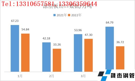 從出口量來看,2022年受疫情、烏俄衝突等影響,一季度塗層板帶出口量為135萬噸,較2021年出口量縮減17.14%,且從最近的四月份數據來看,塗層板(帶)出口36.72萬噸,月環比降幅22.37%,年同比降幅43.33%。1-4月份塗層板(帶)出口總量171.11萬噸,年同比降幅24.58%。