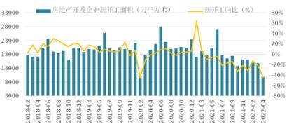 1-4月份,房屋新開工麵積39739萬平方米,同比下降26.3%;從單月來看,自去年4月份開始,新開工麵積持續負增長,今年4月份同比降幅由上月的22.2%擴大至44.2%,新開工下行明顯加快,對後期施工和行業的投資形成製約。