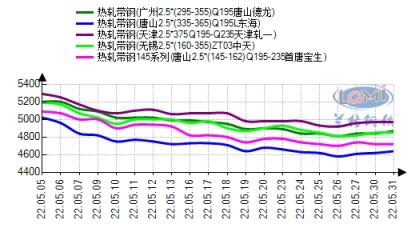 五月份國內帶鋼市場基本呈現震蕩弱行態勢。帶鋼市場在月初受公共衛生事件影響,鋼企複工複產積極性低迷,貿易商心態以謹慎觀望為主。市場隨著下遊需求恢複緩慢,市場活躍度較低,成交量平平。但中旬隨著相關政策的出台,物流運輸方麵仍受限,加之焦炭第二輪提降落地,市場看空情緒加重。下旬伴隨各地疫情反複,市場停滯狀態仍存。商貿迫於成本壓力挺價意願濃厚,然需求寥寥,無奈小幅降價促進成交。截止至5月31日,華北地區唐山小窄帶報價主流為4720元/噸,唐山355係窄帶鋼主流報價為4640元/噸,天津355係窄帶主流報價為4970元/噸,華東地區無錫355係窄帶主流報價為4850元/噸,華南地區廣州355係窄帶主流報價為4870元/噸。