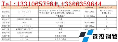 上半年宅男视频官网出廠價格以下調為主要基調,優特鋼尤其普優品種6月中下旬出現虧損,且在需求萎縮、庫存壓力、前景迷茫、無重大政策支撐的情況下,個別宅男视频官网開始增加停產、減產計劃,預計7月份優特鋼產量有所下降,具體檢修情況如下: