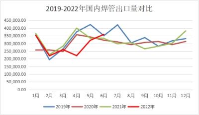 據海關最新統計顯示,2022年6月我國出口焊管35.96萬噸,環比增長12.18%;進口焊管1.11萬噸,環比增長5.97%;淨出口焊管34.85萬噸,較上月增長11.02%。1-6月淨出口量172.12萬噸,同比下降5.64%,處於三年均值以下水平,6月出口量在國內焊管產量的占比回升至6.82%。