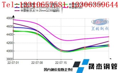 綜合來看,7月份國內中厚板市場價格整體呈現先抑後揚的格局。截止7月29日,重點區域邯鄲價格為4160元/噸,環比下跌340元,江陰價格為4610元/噸,環比下跌450元,天津4120元/噸,環比下跌390元,樂從4240元/噸,環比下跌490元,目前樣本十大重點城市均價為4216元/噸,環比下跌434元左右。
