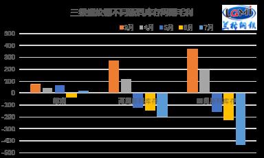 7月份由於原料庫存周期不同,成本下降幅度有明顯差異,宅男在线小视频鋼管市場均值震蕩下行,7月份品種噸鋼毛利相比上月表現分化。以三級螺紋鋼為例,以即期原料成本測算7月份毛利空間較上月上升49元/噸,由虧轉盈;而以兩周、四周原料庫存周期測算7月份毛利空間均在虧損區間繼續下行,兩周原料庫存周期測算虧損幅度較上月擴大53元/噸,以四周原料庫存周期測算7月份虧損空間較上月擴大206元/噸(詳見圖2)。