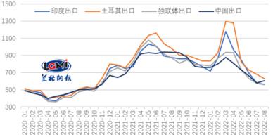 7月份,出口市場競爭激烈,主要出口國繼續下調宅男在线小视频鋼管出口報價。進入8月份,海外需求持續疲弱,各國宅男在线小视频鋼管出口報價仍有所下調,而國內市場出現反彈,出口報價有所上漲,雲商平台監測數據顯示,2022年8月5日,印度、土耳其、獨聯體熱軋卷板出口報價(FOB)分別為565美元/噸、630美元/噸和560美元/噸,均較7月底有所下跌,中國熱軋卷板出口報價(FOB)為605美元/噸,較7月底有所上漲。