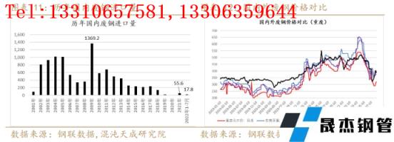 綜合而言,廢鋼供應的多寡其實與宅男在线小视频鋼管的需求息息相關,無論折舊廢鋼、加工廢鋼還是自產廢鋼都與國內宅男在线小视频鋼管的消費有直接的關聯,而進口廢鋼的增減在一定程度上也可以反映國外宅男在线小视频鋼管消費的好壞,所以廢鋼的供應量實際上也是一個反映需求的指標,這從廢鋼供應基地庫存與五大材表需的相關性也可得到佐證。